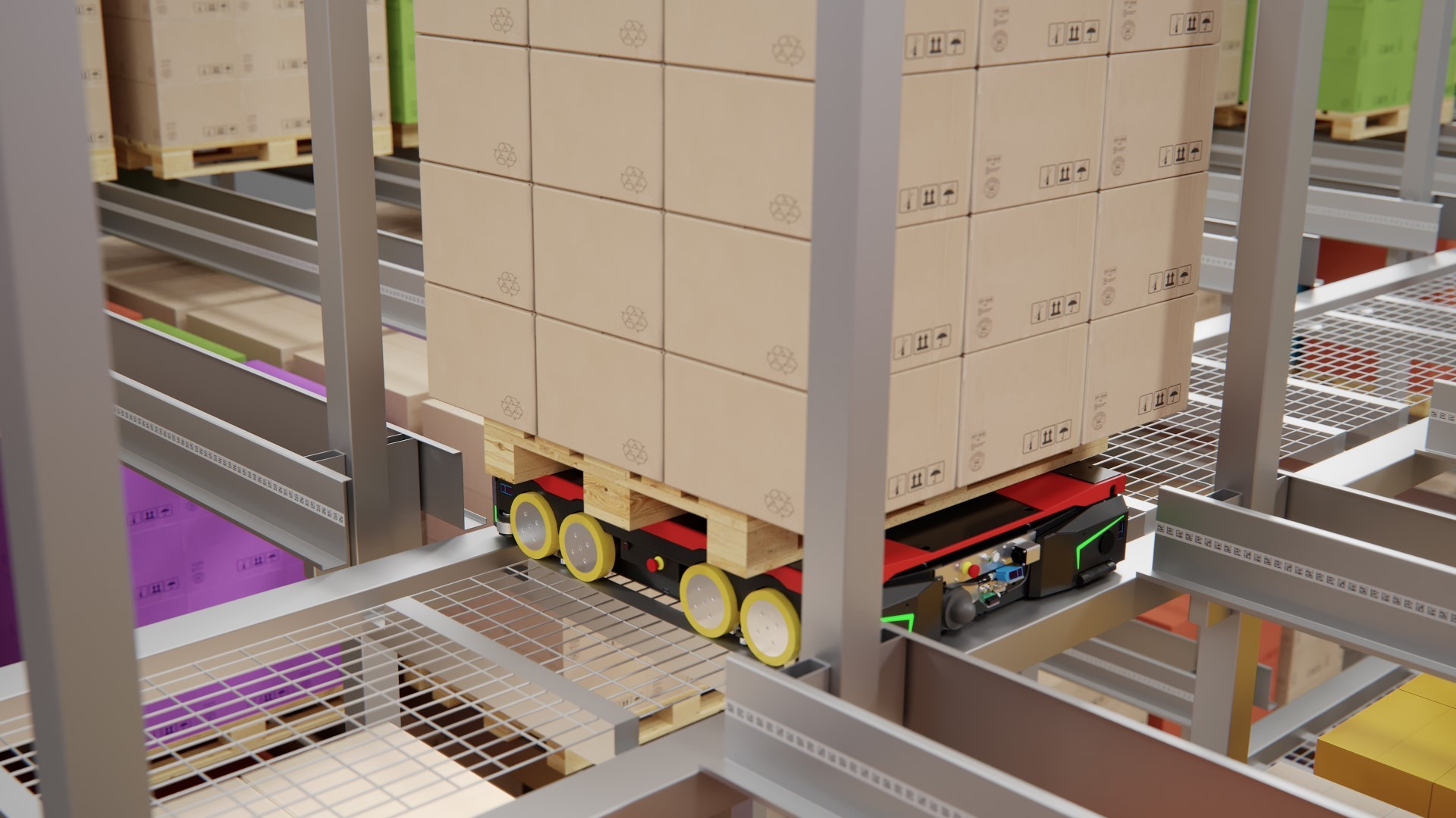 - There, the goods are picked up by a 4-way shuttle and transported via the main lanes to their storage location in one of the storage channels.